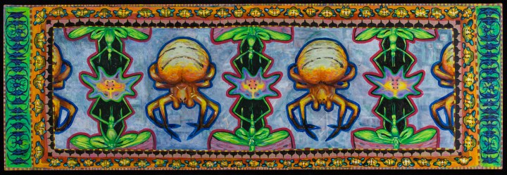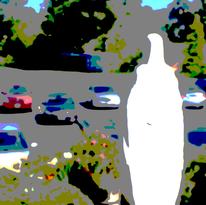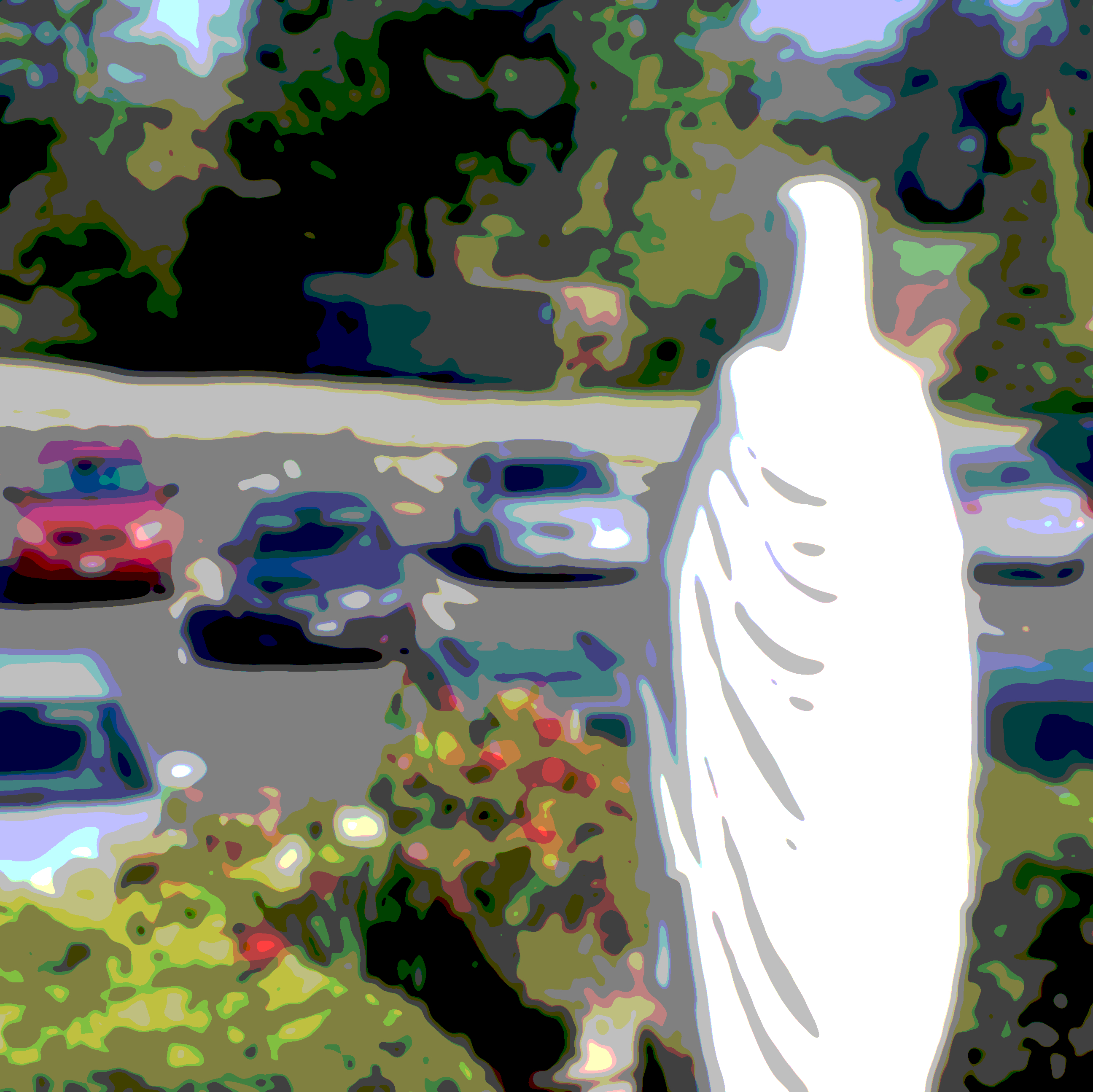 Above you see the second posterized source photo from my last post. I used this image to paint over the first layer with semi transparent paint. Below you see the result. So far, pretty bizarre! I’ve got a ways to go on this one!