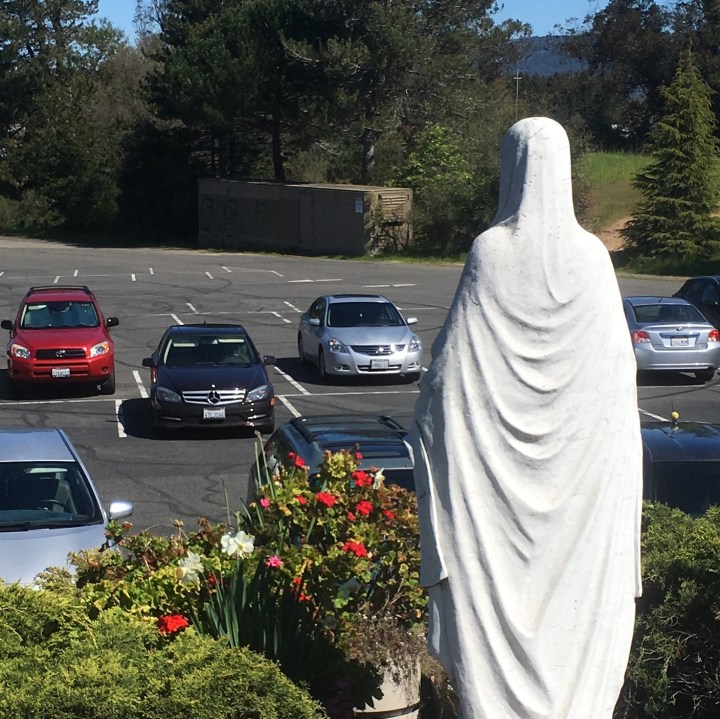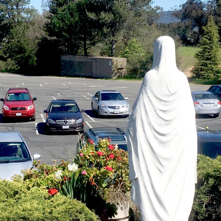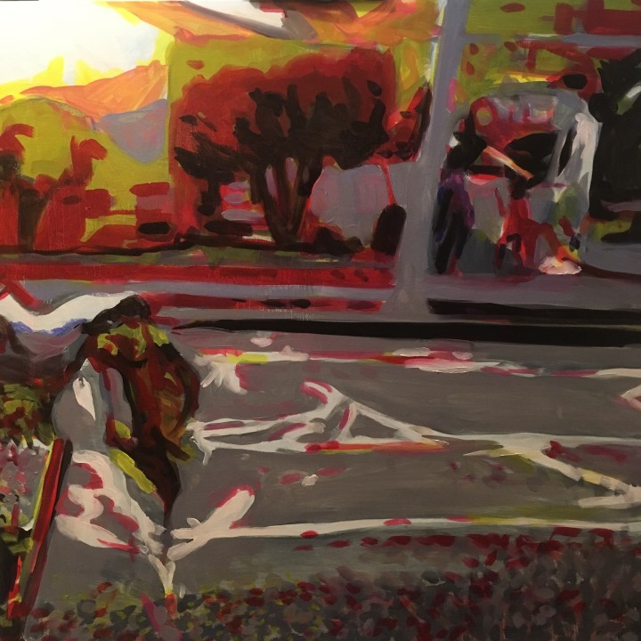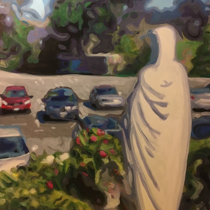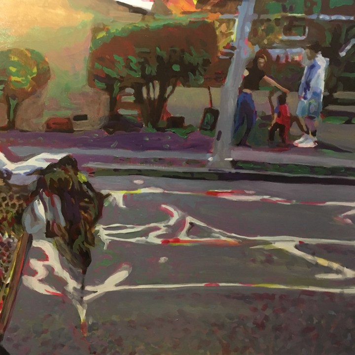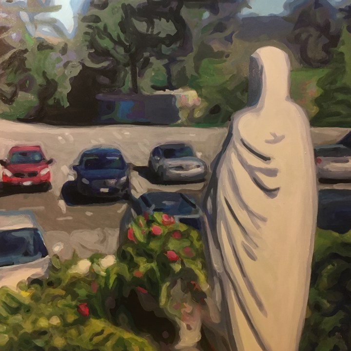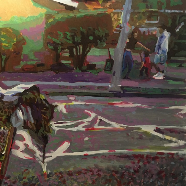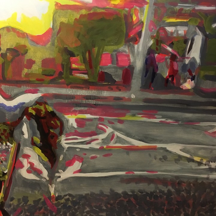 I often work on two or more pieces at a time. Right now I am also working on a painting based on a photo I took looking over a church parking lot. Below I will alternate between the source and painted versions.