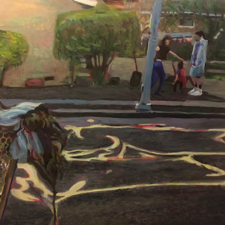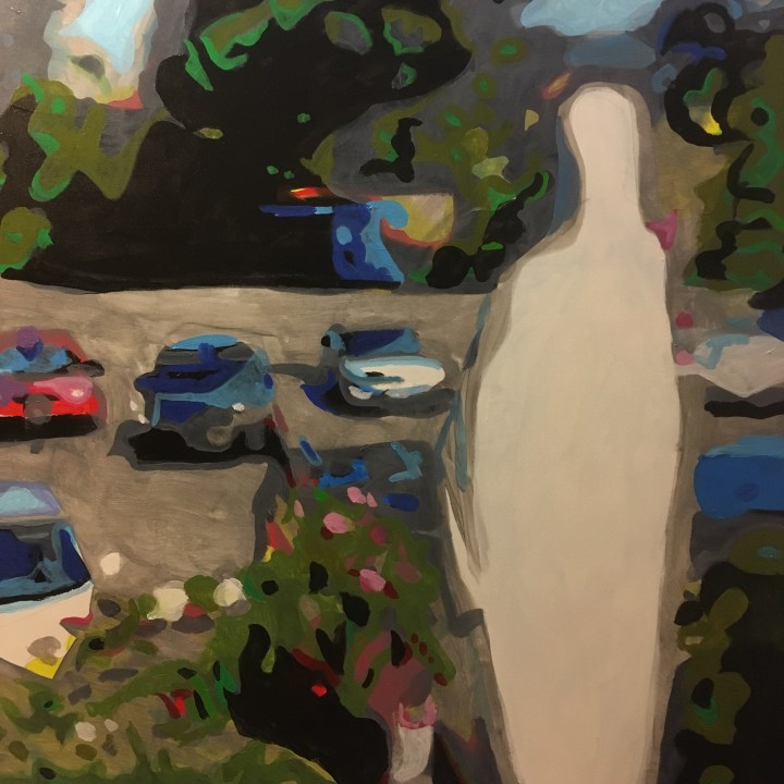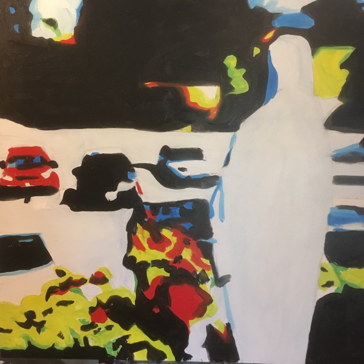 Continuing on with the parking lot painting from last post, you see above the next layer, one step more toward the source photo, and below, the layer added to my existing canvas.