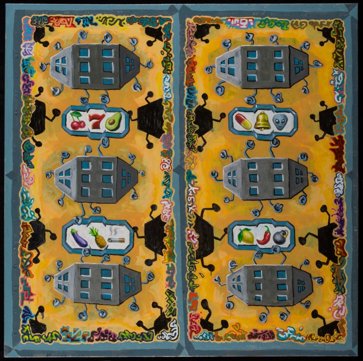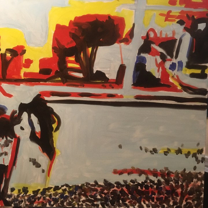 Welcome back! Here we are at the final source photo (the original shot before all the color separations). I am now working toward my final version. I’m not sure just how ‘crisp’ I want the final to be, as I like the ‘paint by numbers’ quality of the separations. Below, you’ll see two succeeding shots of the canvas.