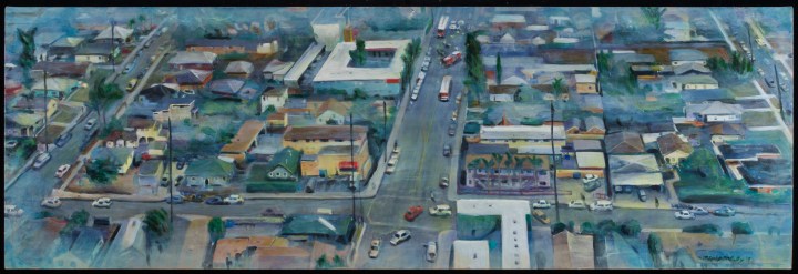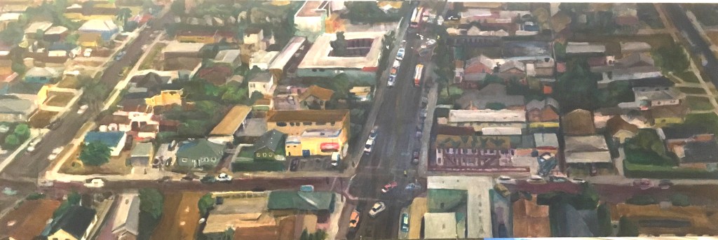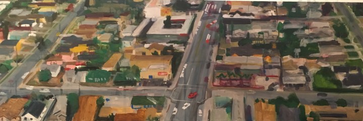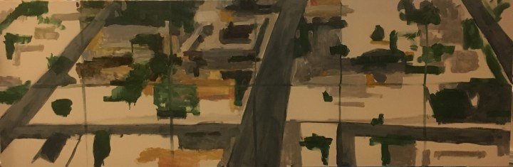 I’ve been focused the last few weeks on a new piece based on a photo (above) I took from an airplane shortly before landing at LAX. I cropped it to correspond to a 5 foot by 2 foot canvas. In the photos below you’ll see my progress so far.